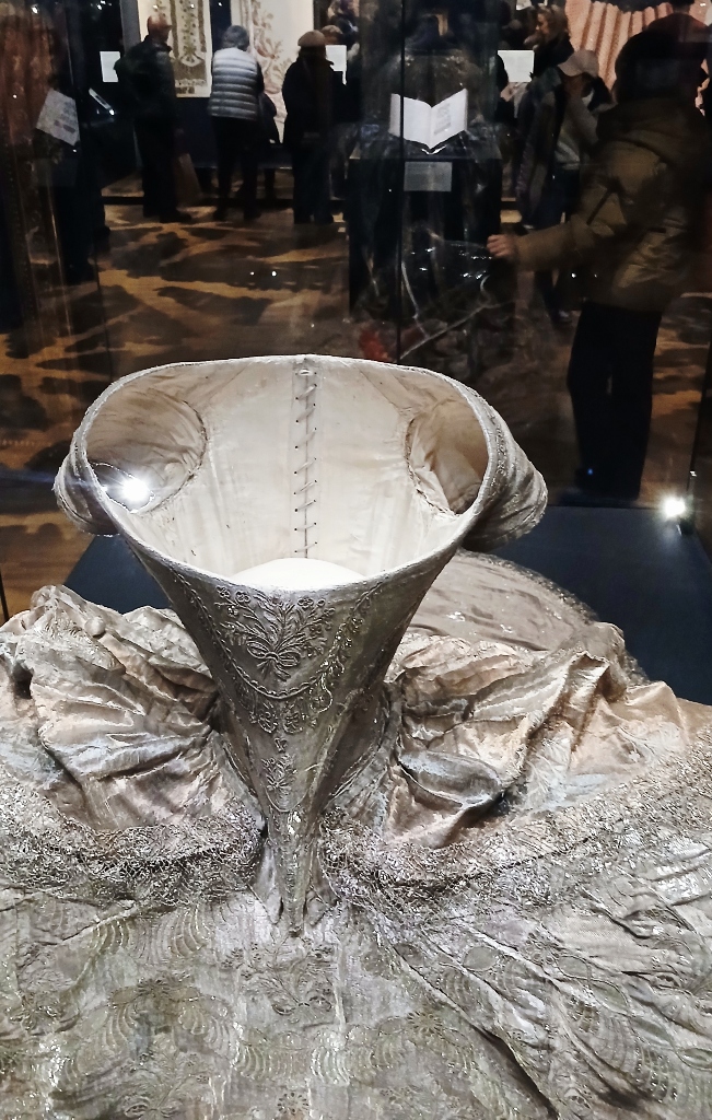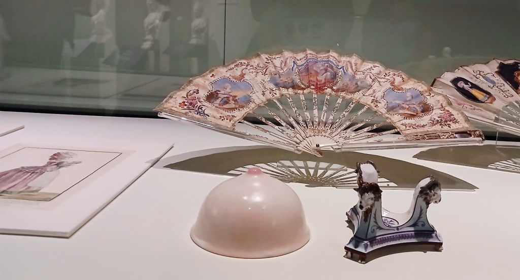 The following rooms display many beautiful trivialities which had filled her days and nights: dressing tables and seating furniture, jewellery, loads of them, handcrafted trinkets of the highest quality, knick-knacks and curiosities such as a breast cup based on ancient myth, lace and fabric designs, fans, and sketches for sculptural hair monstrosities which were trend at the time, a copy of the then-best-selling novel Les Liaisons Dangereuses (1782), which she was known to have owned, defamatory pamphlets from the declining years, and finally dresses inspired by her timeless style.