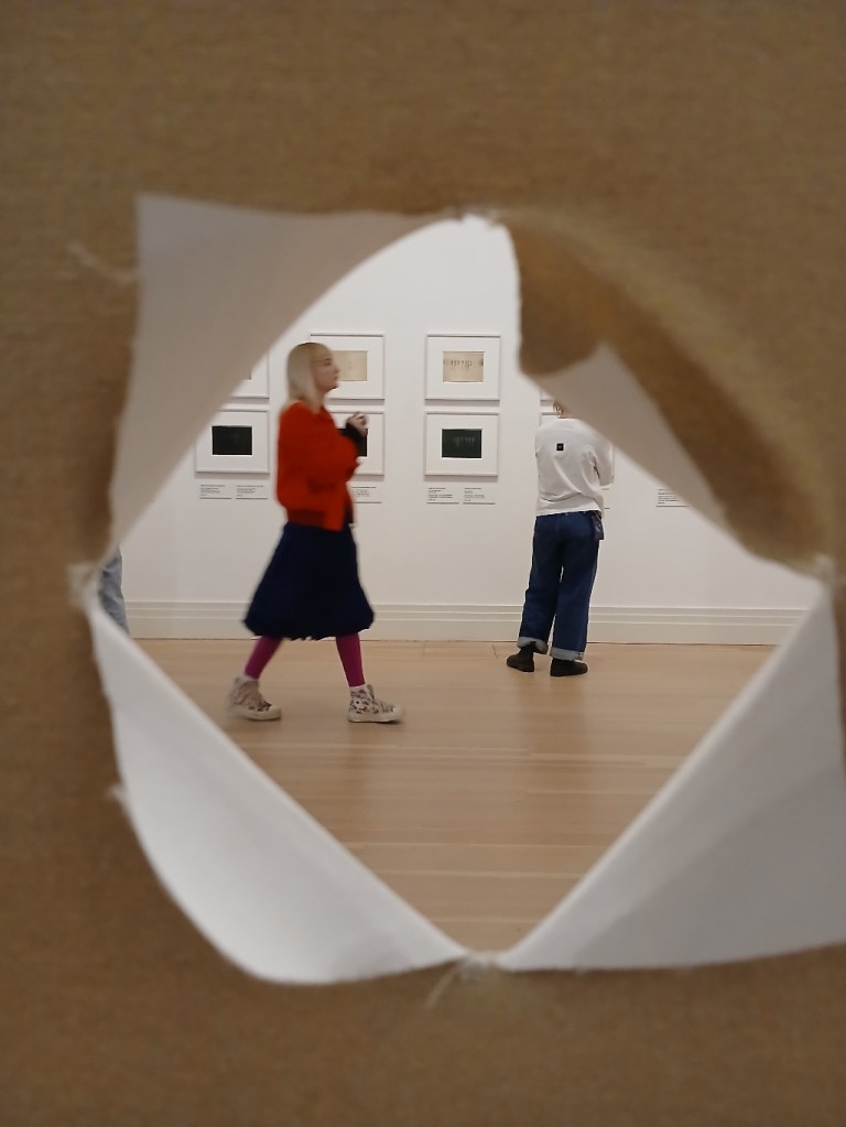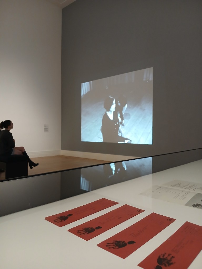 Das gerahmte, dunkel gefärbte Blatt mit den schwach lesbaren japanischen Schriftzeichen darauf ist die Anleitung, das eigentliche Werk entsteht jedoch in der Ausführung, oder schon mit den Gedanken daran. Zu Onos ersten Instructions gehört „Lighting Pieces“, wir sehen im ersten Saal im Obergeschoss sowohl die Anleitung des Streichhölzerentzündens als auch den Film und Fotografien.